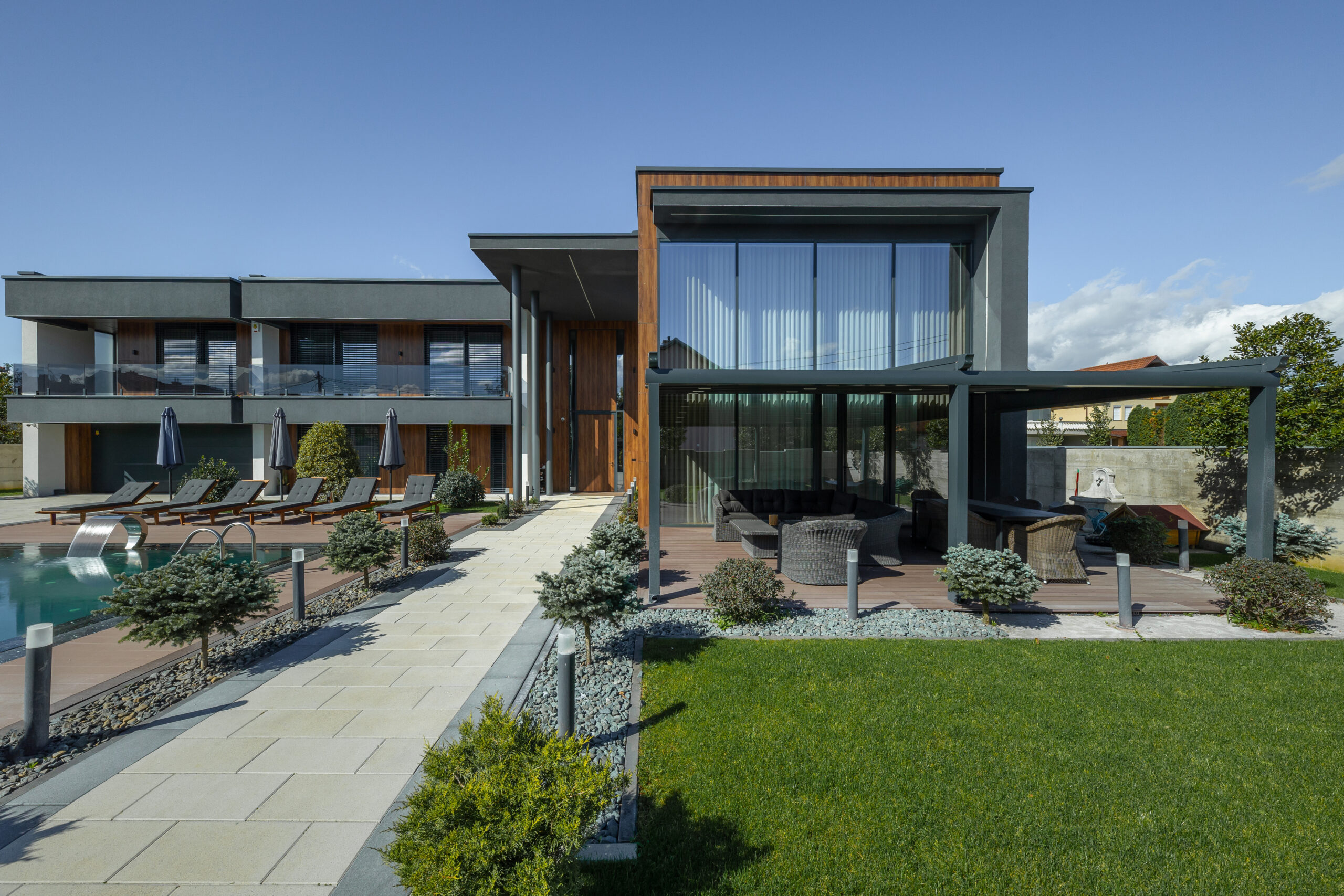 Welcome Private Residence in Vushtrri, combining modern architecture with spacious, light-filled interiors and strong energy efficiency. Expansive glazing connects the interior with the surrounding environment, while open-plan spaces and clean detailing support a refined and sustainable living experience.
